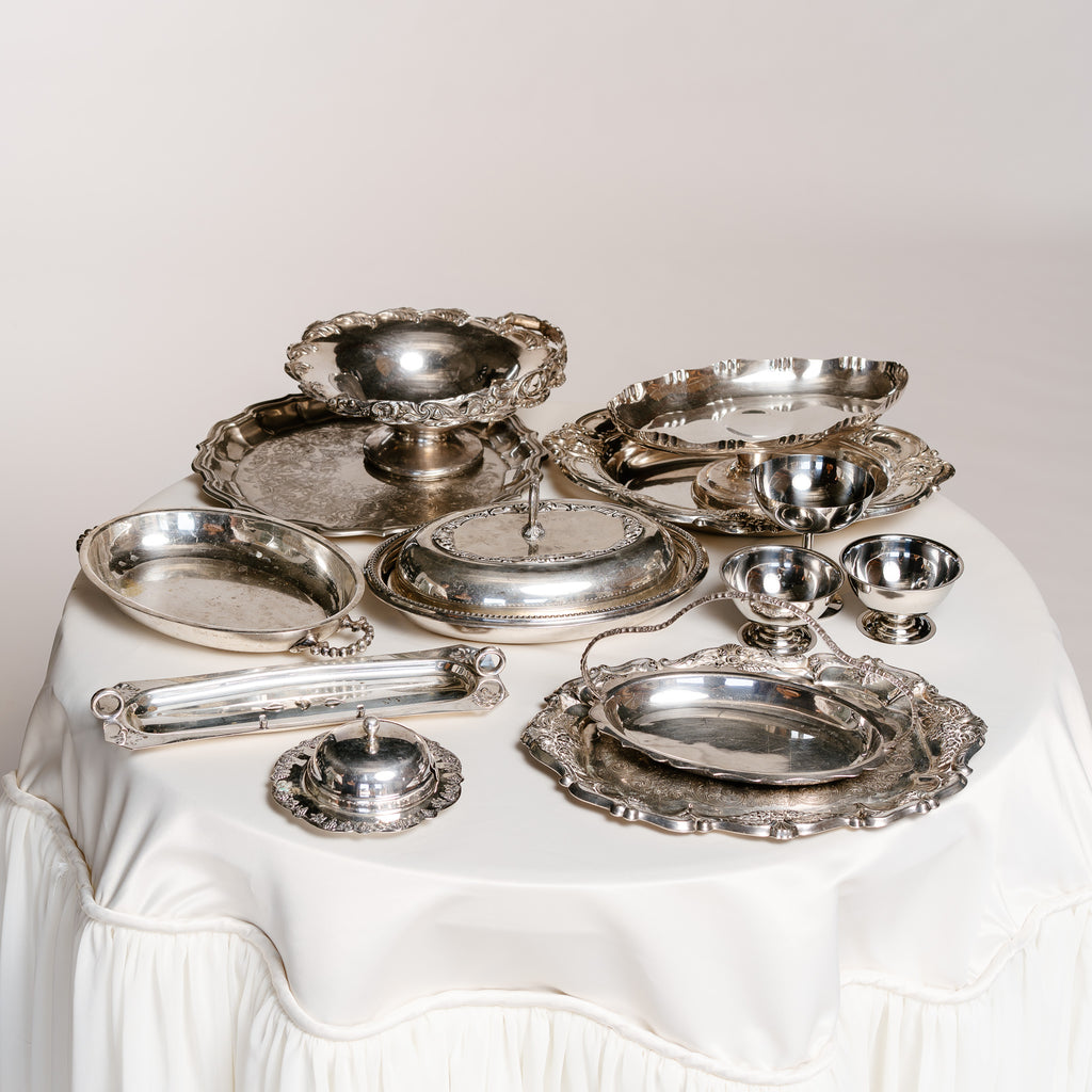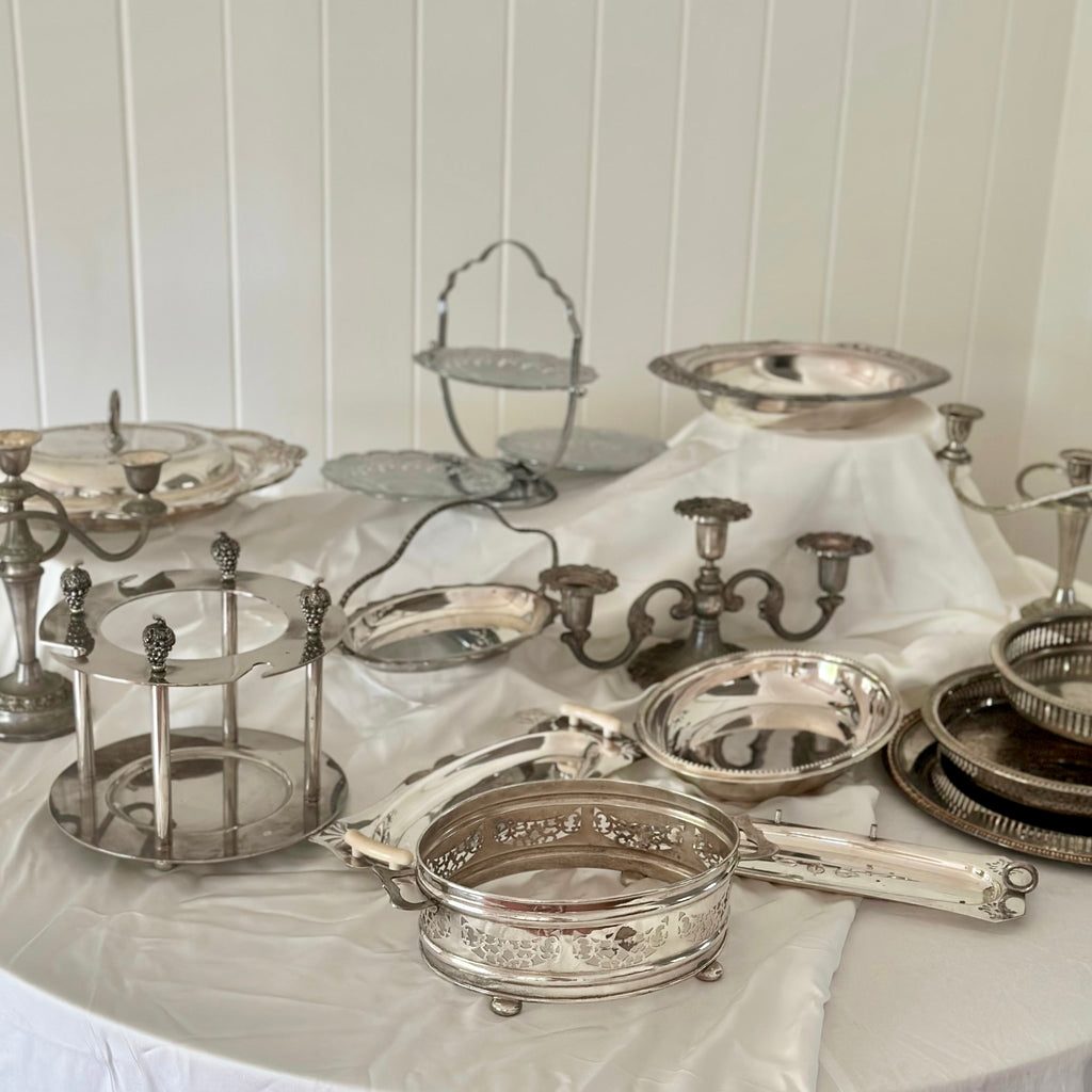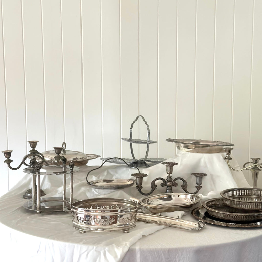 Our selection of Ornate Silverware features a total of 14 Vintage Ornate Silver pieces to be styled as you desire.