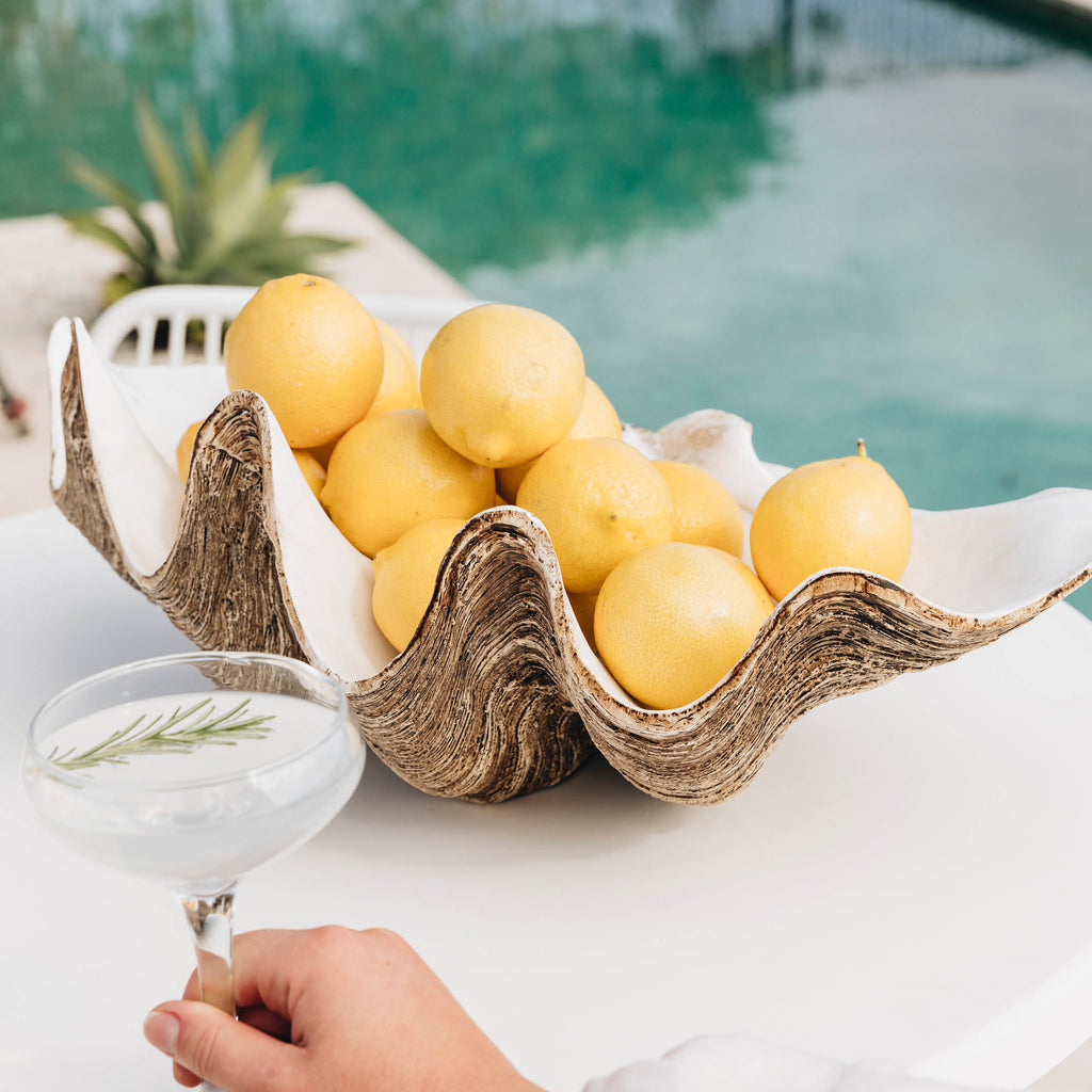 Oversized, giant clamshell. Ideal for the perfect centerpiece to add coastal elegance to space. Use it as a decorative bar feature, filled with fresh citrus fruits, or to serve chilled champagne to your guests.