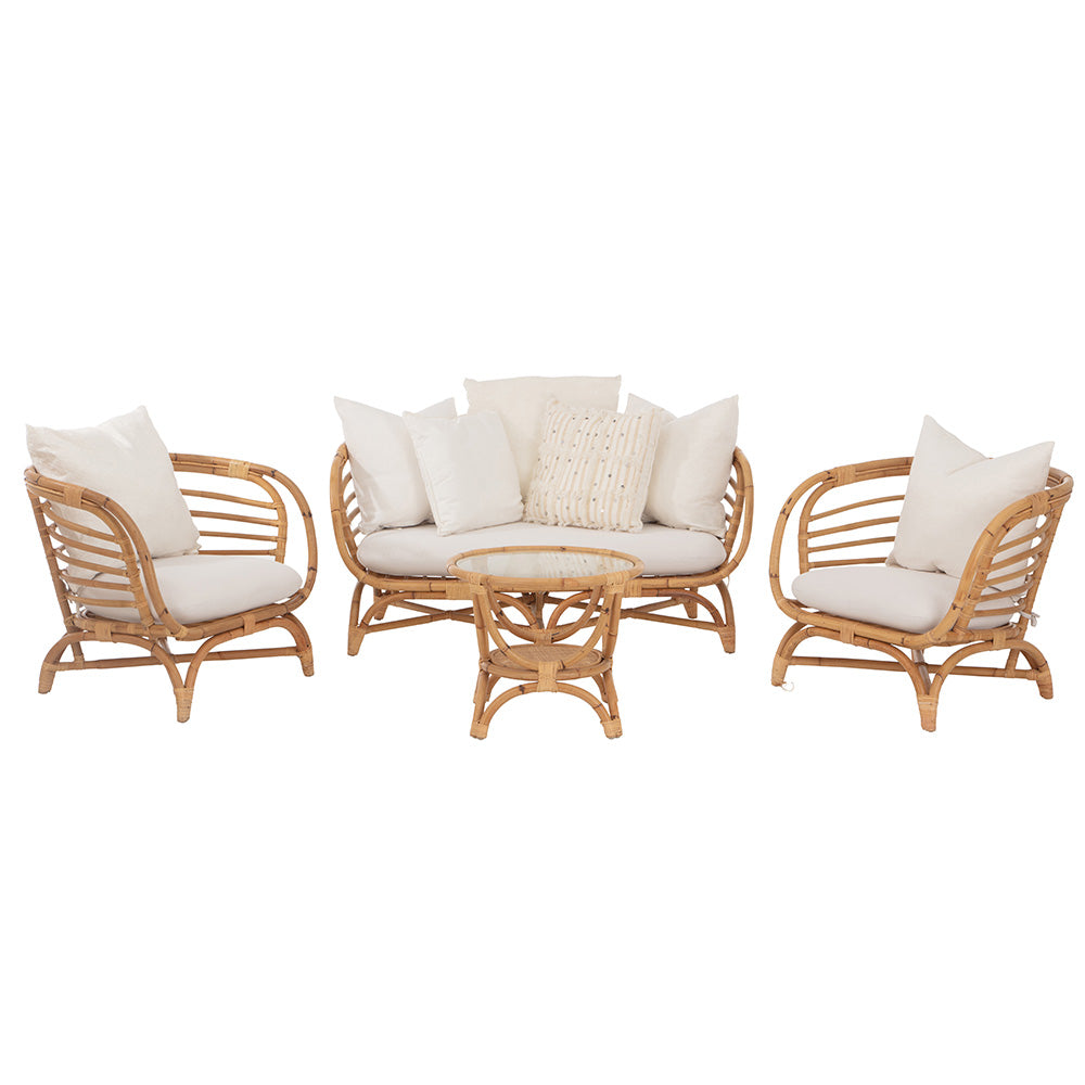 Four Piece Rattan Lounge Setting features two Single Chairs, and one 2 person lounge, along with a Side Table and Cream coloured cushions.