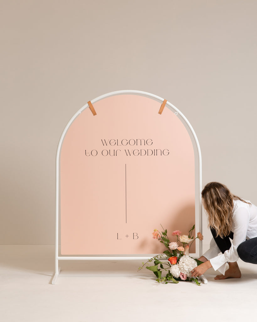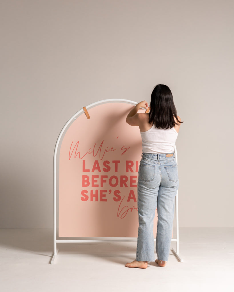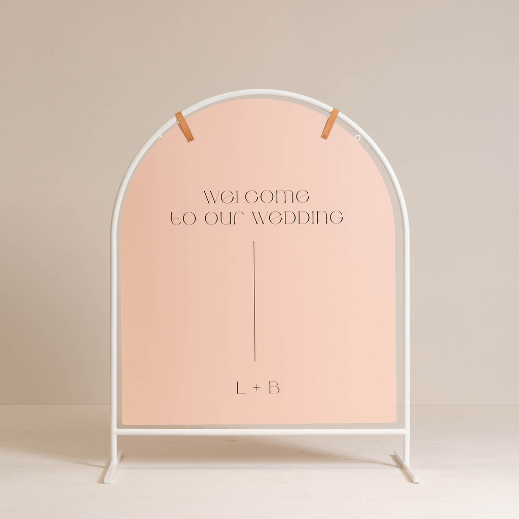 A simple Dome Shaped Arch Sign Stand. Can be decorated with florals or balloons. To avoid artwork errors being made, please refer to the Dieline below.