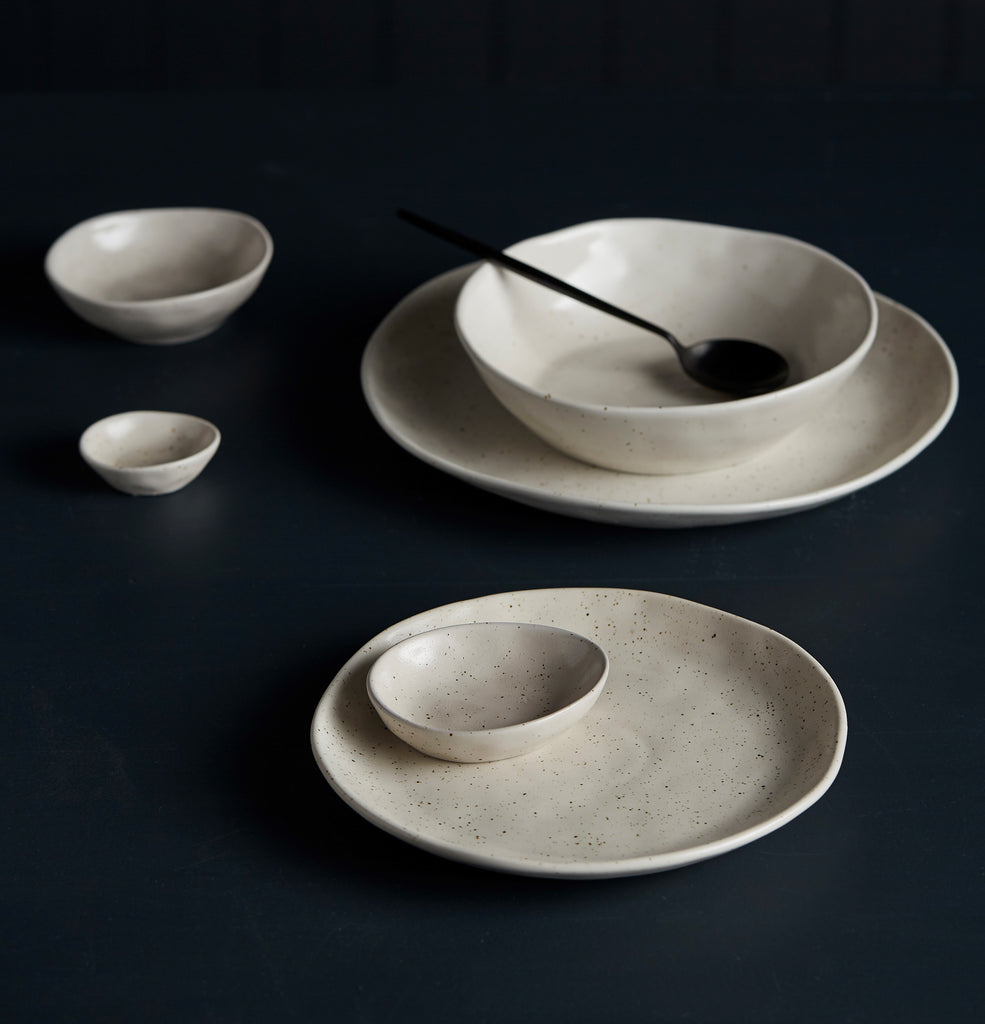 Hospitality grade, high-fired porcelain dinnerware collection in a reactive glaze, Earth is available in black and natural colourway.